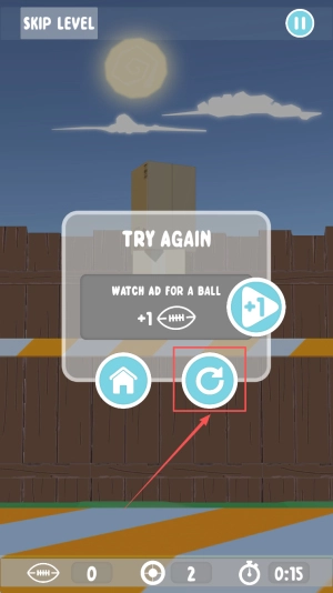 再次尝试:当倒计时显示0:15且出现“TRY AGAIN”提示时,点击“WATCH AD FOR A BALL”按钮,看完广告后即可重新开始。