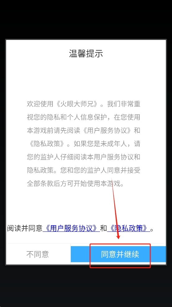 在阅读完游戏的《用户服务协议》与《隐私政策》后,点击“同意并继续”按钮,即可接受相关条款并开启游戏。