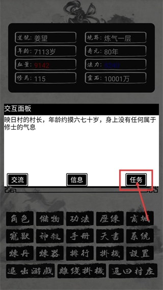当处于【当前位置-映日村】(这是距离映日湖最近的凡人村落)时,点击【村长】选项来触发互动,以此推进剧情和任务。
