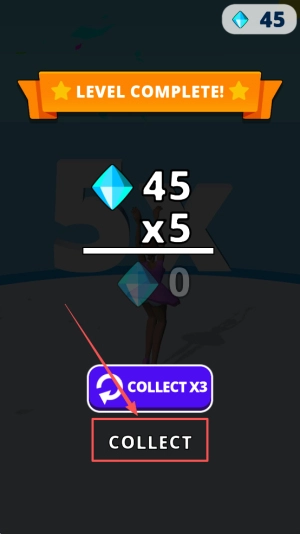 领取奖励的操作如下:当屏幕上出现“LEVEL COMPLETE! 45 X5”的显示时,点击标有“COLLECTX3”的按钮,这样就能获取三倍奖励并自动进入下一个关卡。