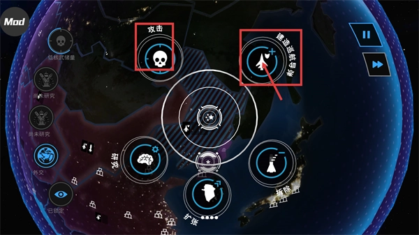 点击【攻击】按钮启动打击行动,与此同时启用【建造巡航导弹】功能来补充武器库存,为接下来的战局储备充足的火力资源。