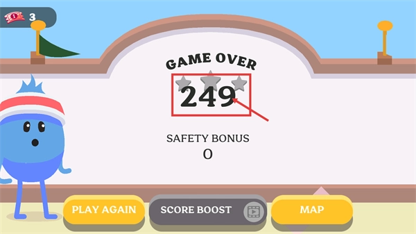 关卡失败后会显示【249】的得分,点击【PLAY-AGAIN】按钮就能重新挑战该关卡,以便进一步提升得分和通关表现。