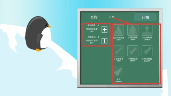 进入游戏后点击【开始】按钮,通过【+】按键来提高【滑翔高度】和【克服阻力】的初始数值,再根据实际需求挑选合适的【喷射道具】,比如【小型推进器】之类的。