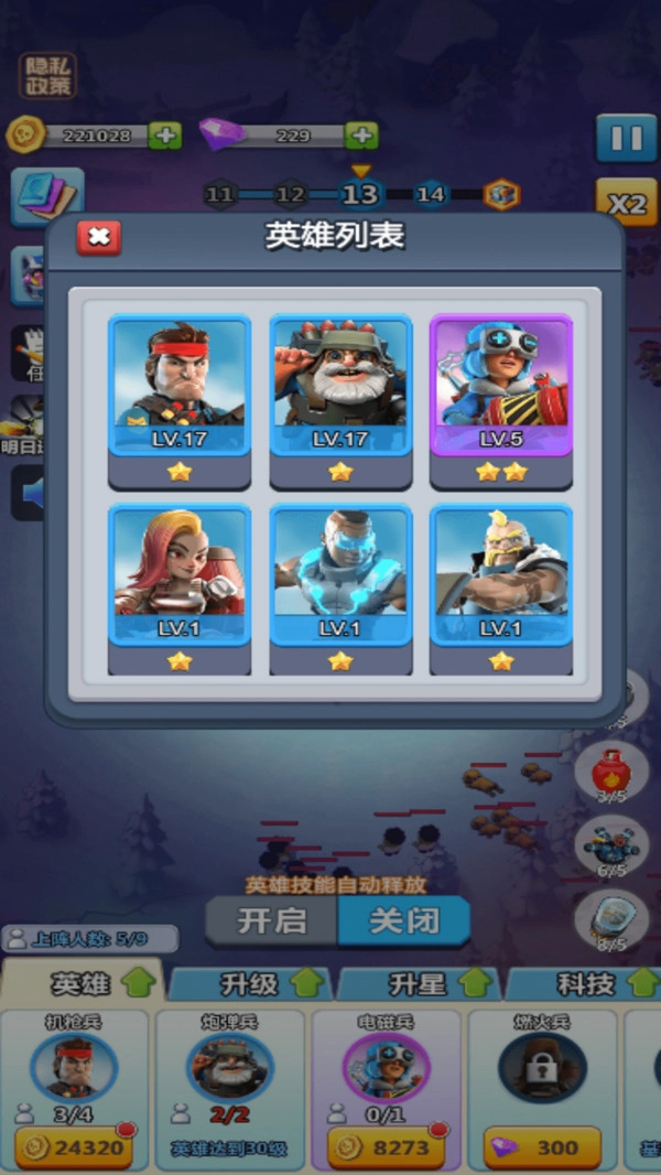 收集碎片提升星级,消耗金币进行升级,合理搭配科技系统,以此增强英雄的属性数值与技能效果。