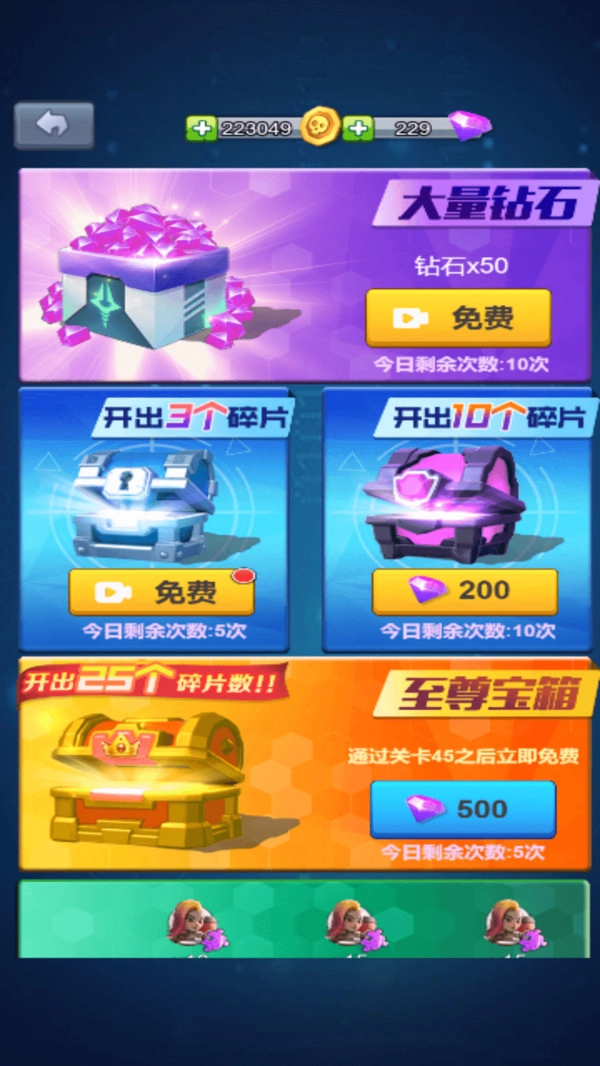 每天完成签到、开启宝箱这些任务,还能通过看广告领取免费的钻石和碎片,这样就能更快地扩充你的英雄池了。
