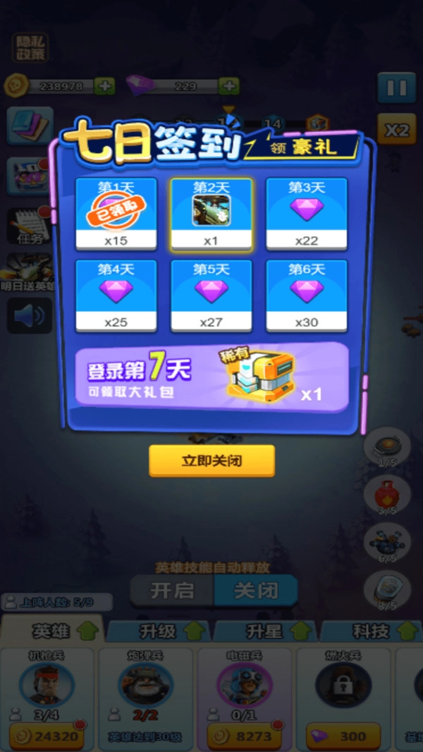 前期关卡想稳过并积累资源,优先选用系统赠送的强势英雄,比如高等级机枪兵这类就很合适。