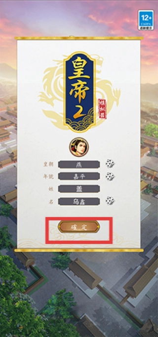 游戏开局时,玩家能够自定义【皇朝】、【年号】、【姓】、【名】这些内容,全部设置好之后,点击【确定】按钮即可。