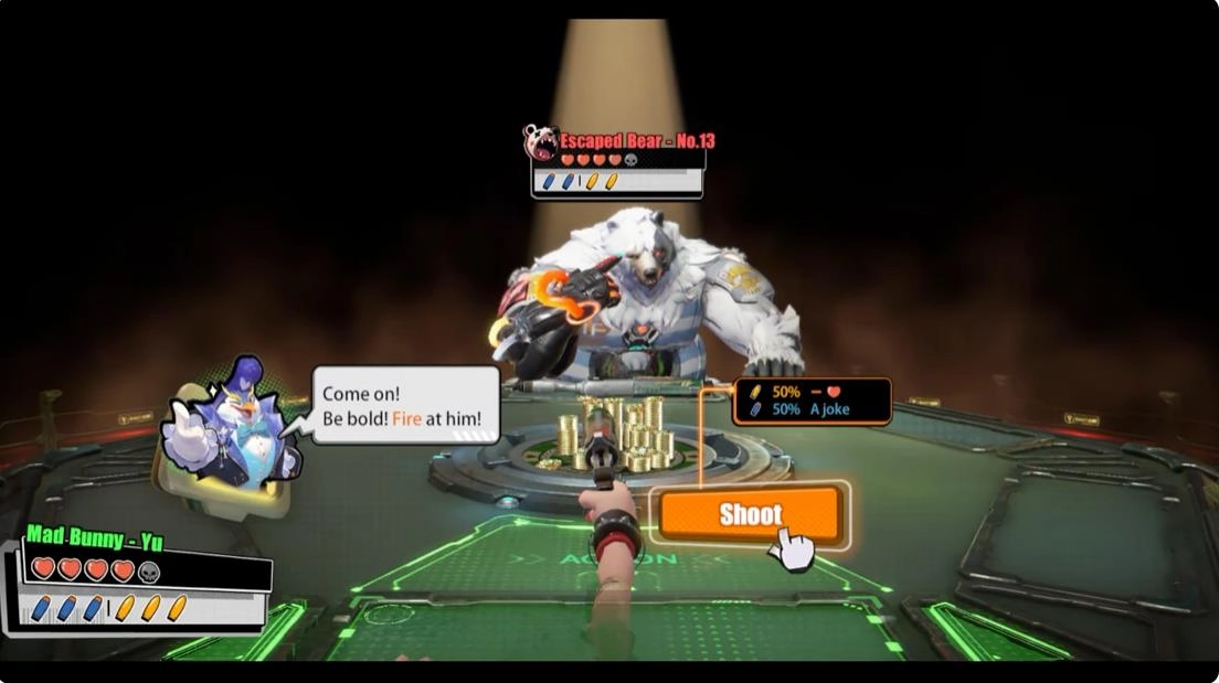 挑选射击目标,操控自身或任意一名敌人,依据最终结果来确定接下来的行动策略。