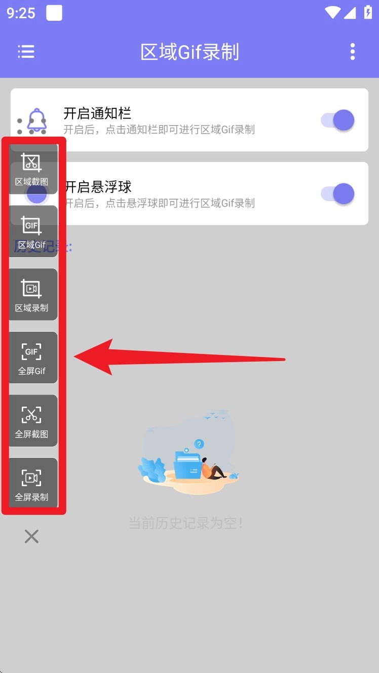 2. 回到主界面后,点击左侧的功能栏,就能选择“区域GIF”“区域录制”等多种不同的录制方式。