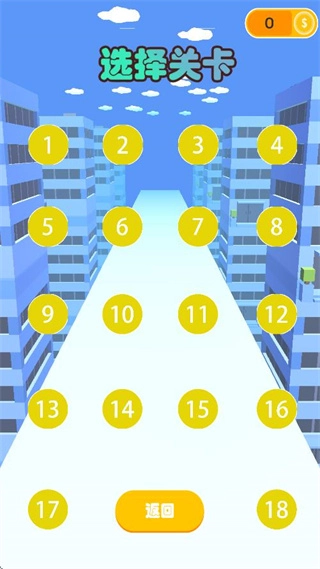 在游戏界面的浅蓝色道路上,分布着标有1至18数字的黄色圆形关卡按钮,点击任意按钮即可选择对应关卡;若需退出,可点击左上角的橙色数字0按钮,或右下角的黄色返回键。