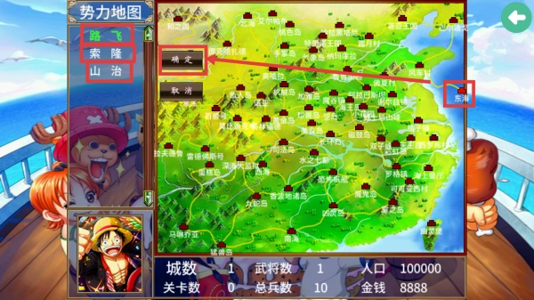 按照动漫故事的推进节奏,规划出东海、伟大航路、新世界这三个阶段的地图。要想闯过那些特殊洋流构成的关卡,就得招募伙伴,并且对梅利号进行升级才行。