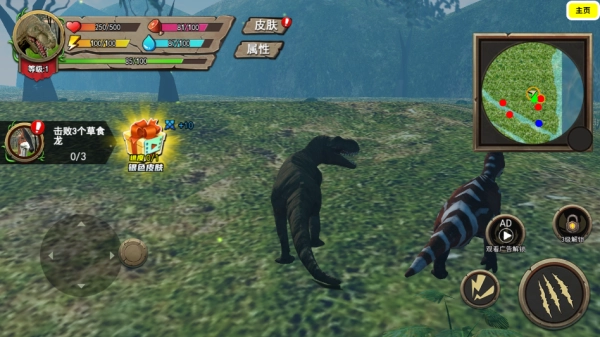 使用屏幕左下角的虚拟摇杆操控恐龙移动。