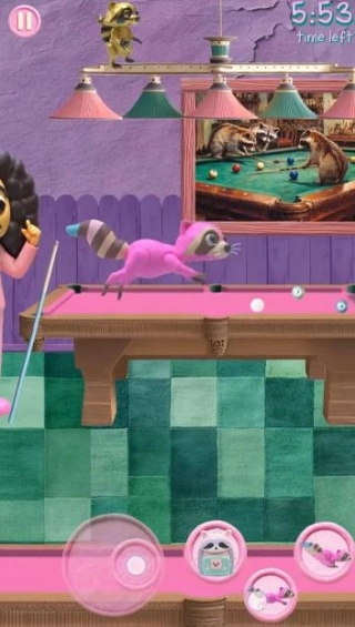 通过虚拟按键控制浣熊的移动与跳跃,避开障碍物。