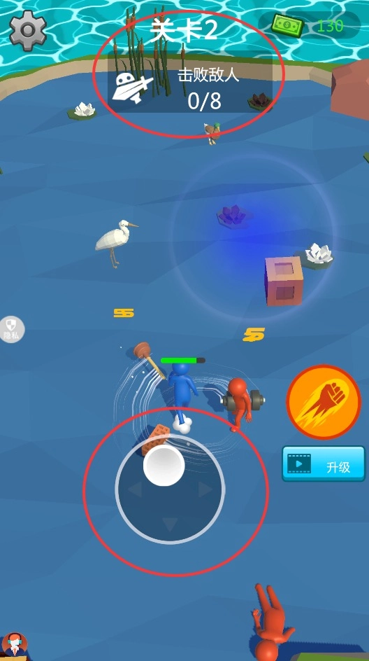 游戏界面顶部会展示当前关卡的目标,具体包含需要击败的敌人数量以及完成进度;玩家可借助方向键操控角色移动,而角色的生命值则显示在头顶的状态栏中。