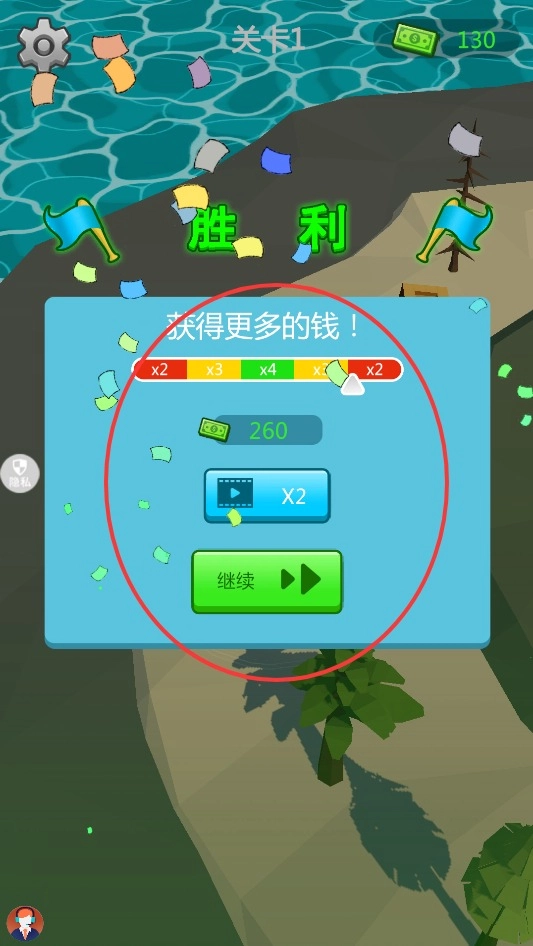3、在成功击败目标并通关后,系统会弹出结算界面展示所获得的金币奖励,点击界面上的继续按钮即可回到主界面开展后续的操作。