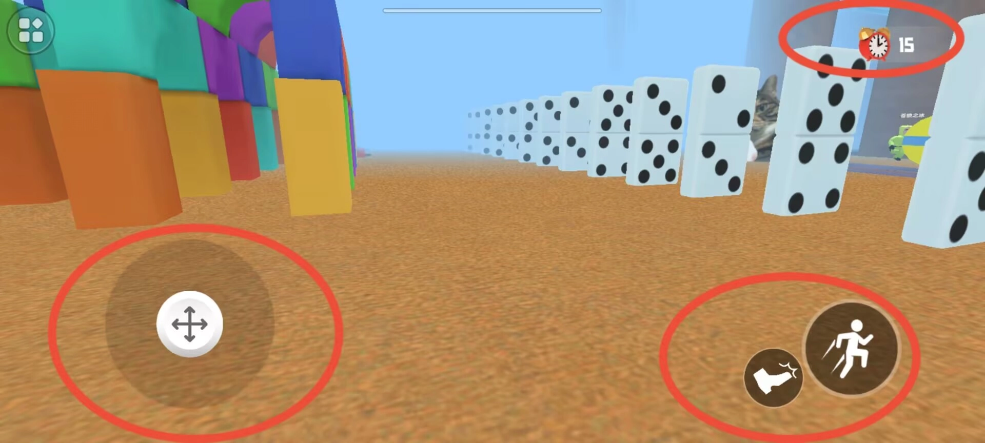 2、核心目标是尽可能延长存活时间,左下角是方向操控区域,右上角显示生存时长,右下角则为战斗技能的触发区域。