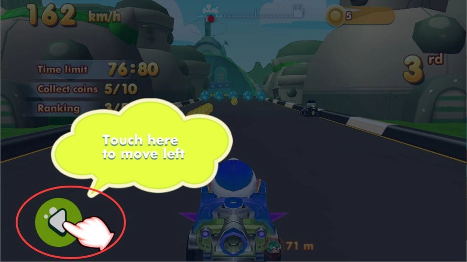 1、轻触左侧屏幕可操控赛车向左转向,遇到急弯时需提前点击,以保持稳定过弯且不偏离赛道。