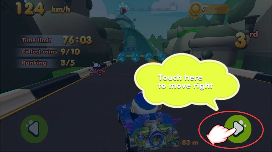 2、右侧对应的区域可控制右转方向,搭配左转操作能灵活穿梭在复杂赛道中,避开障碍物和其他对手。