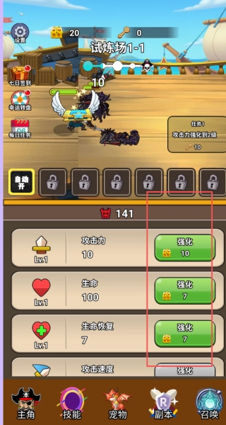 进入游戏后,核心玩法为操控角色在「试炼场」里不断战斗并提升等级。