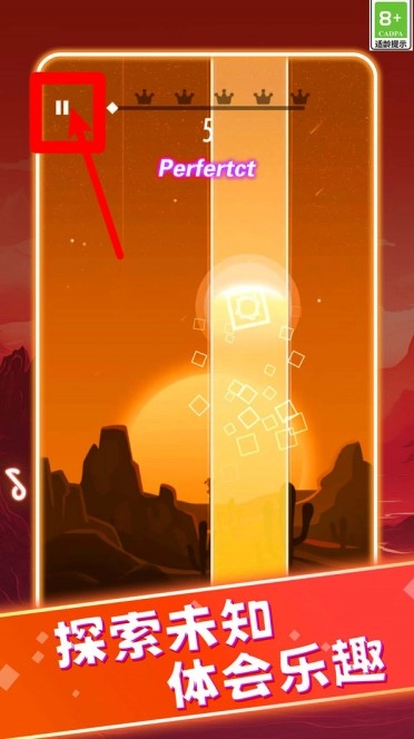 2. 点击左上角的暂停按钮,就能随时暂停节奏挑战,让手指得到放松,等调整好状态后再继续游戏。