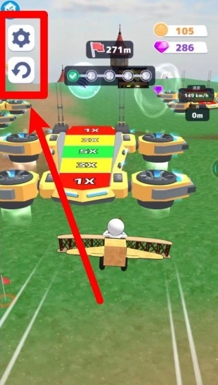 2. 界面左上角的齿轮图标是设置菜单入口,旁边的圆形箭头按钮用于重启游戏,方便你随时调整飞行路线或重新开始挑战。