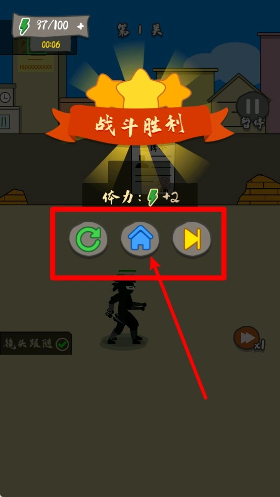 3.战斗胜利后,你可以选择重玩当前关卡、返回主页或者进入下一关;点击界面中间的蓝色房屋图标,就能回到主页面进行重新配置。