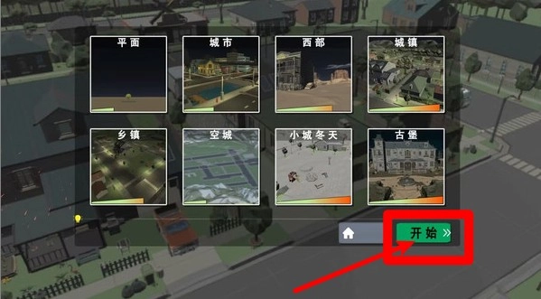1. 挑选城市、古堡、小镇等不同的地图场景后,点击右下角的“开始”按钮,就能进入相应环境开启烟花体验。