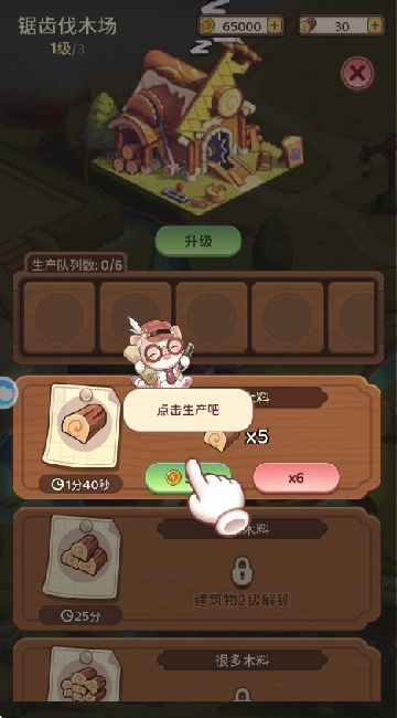 进入伐木场后,点击生产按钮就能启动木头的生产流程,而产出的这些木材可以用于建造更多的建筑。