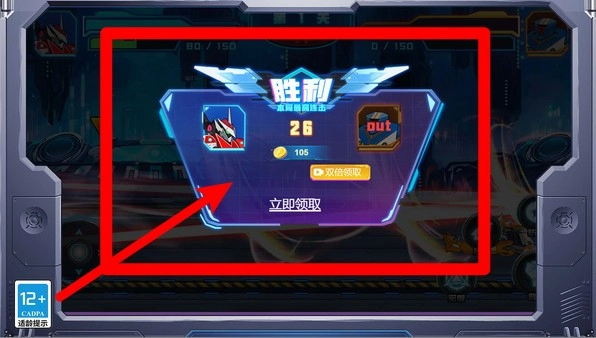 完成对局后会弹出胜利奖励界面,你可以领取金币和角色经验,这些奖励能用来强化机甲的属性和能力。