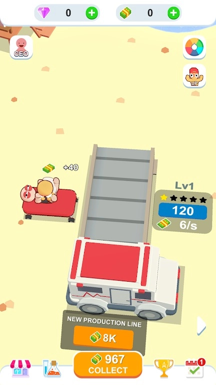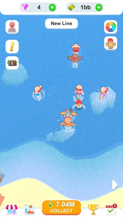 2. 获得的金币可用来升级各类设备,改善海滩环境能吸引更多游客,从而获取更多收益;
