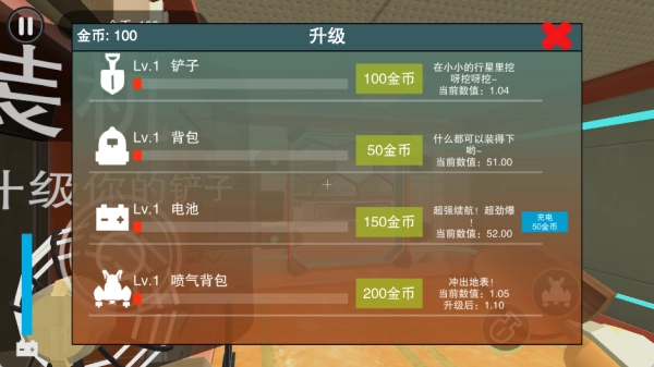 玩家可以消耗金币升级各类工具,以此在挖矿时提高效率,同时还能储存更多矿石资源。