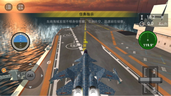 进入关卡后,画面上方会显示任务提示,根据提示,我们当前的任务是让舰载机从甲板起飞,前往东南海域执行视察任务。