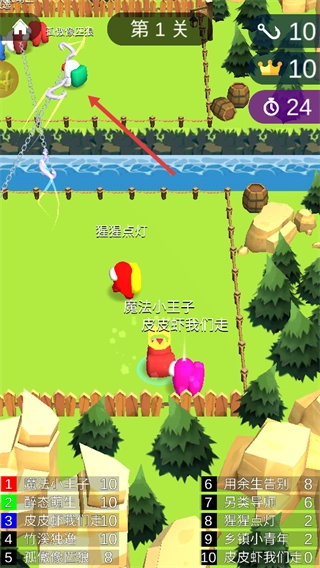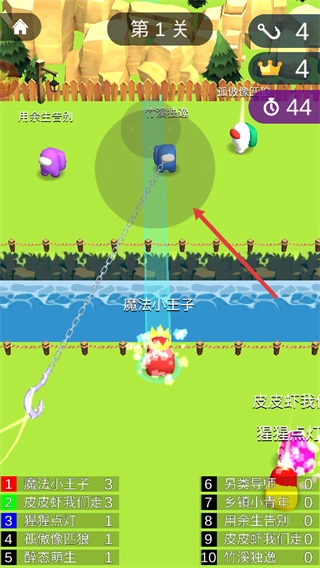 核心操作是点击屏幕蓄力,同时滑动选择发射角度,松开手指后,你的角色便会朝对岸抛出钩索,尝试捕获对手。