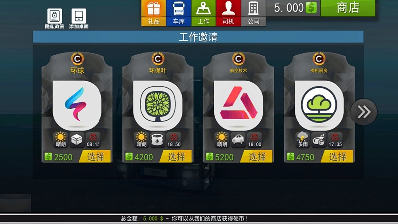 1、进入车库选择卡车,进入工作界面承接运输任务,查看货物信息、行驶路线和天气状况后接活。