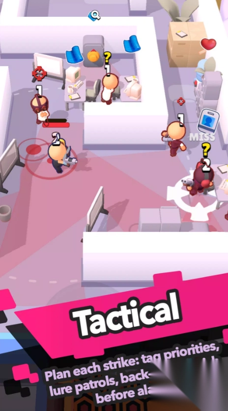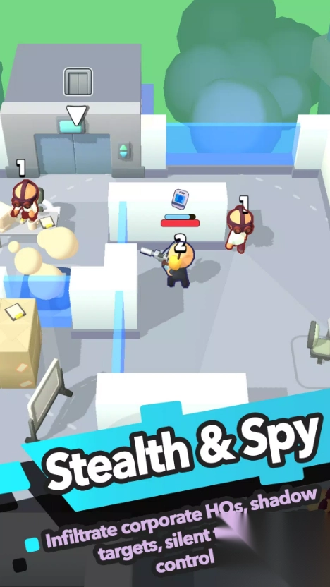 《间谍与杀戮》是一款竖屏潜行射击闯关游戏,整体采用趣味卡通画风。玩家将化身间谍,在房间内搜寻宝藏,同时要巧妙避开巡逻敌人的视线,找到通向下一关的门。随着关卡深入,房间规模会逐渐扩大,结构也更复杂,玩家需更灵活地行动,还能解锁武器,在被发现时展开战斗。