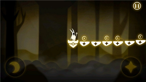 游戏操作依旧简单直观,左下角是月亮按钮,右下角是星星按钮,只需根据悬空符石的提示,精准点击对应按钮就能完成跳跃。这次新增了功能性机关与技能系统,前者大幅提升了关卡的挑战性——比如需要快速连击按钮才能躲避的陨石,以及得全速前进才能逃离的噬人黑幕;后者则能有效提高通关概率,像“生命之泉”技能,能额外增加一次生命机会,即便闯关失败也无需从头开始。