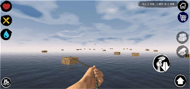 1、开局时用钩子收集资源,注意不要漏木桶,勾不到就下水捞,先造杯子和煮水器,然后造炉子和鱼竿。