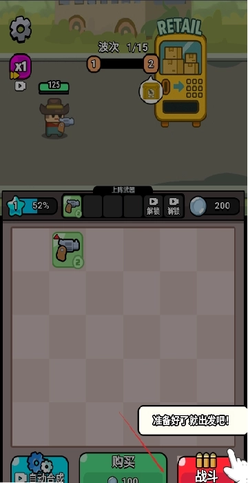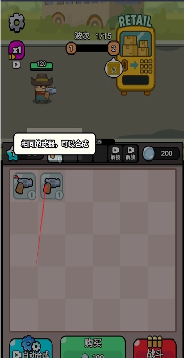 2、合成升级机制:两把星级相同的武器能够合成为更高等级的武器(例如两把1星手枪可合成出1把2星冲锋枪)。