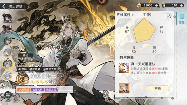 1、金翅小鹏王具有极强的单体爆发力,其技能可以快速收割残血敌人。