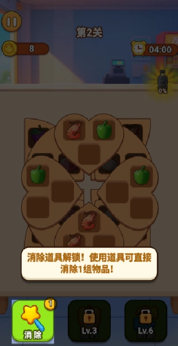 3、把3个相同的物品匹配到同一个货架就能消除,要留意的是,当前排的物品被消除或者移走之后,后排的物品才会显现出来并且可以进行操作。