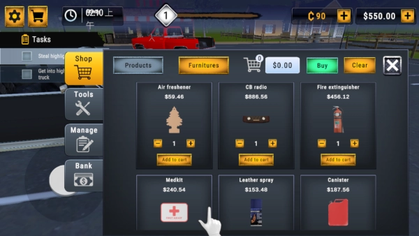 3.可以在商城里购买各类道具,借助不同工具来减小盗车的难度。