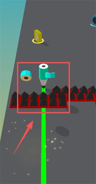 3、在游戏的俯视场景里,看到红色方框里的青色铅笔,用绿色激光束碰到锯齿陷阱,然后向前冲。