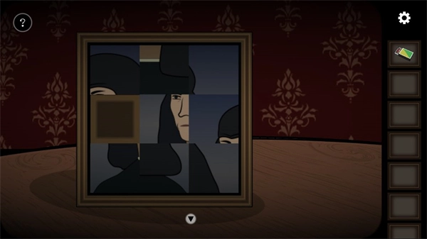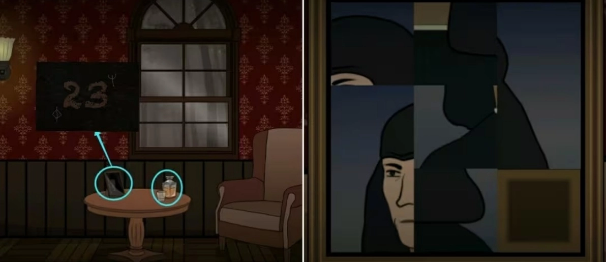来到窗边拿走茶几上的玻璃杯和威士忌酒瓶,然后点击旁边的相框完成上面的拼图,接着再观察人物嘴中的提示(符号对应的数字: