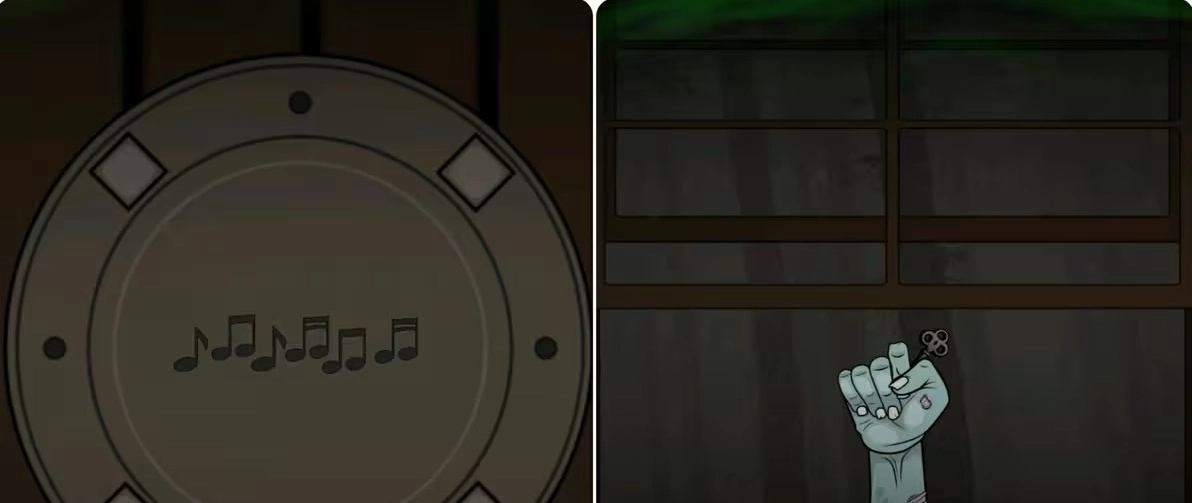 根据提示按①②①;③②③的顺序点击柜子上的骷髅头获得断指,接着打开窗户将其交给外面的尸体的手中换取钥匙,最后用钥匙打开旅社大门完成第一章。