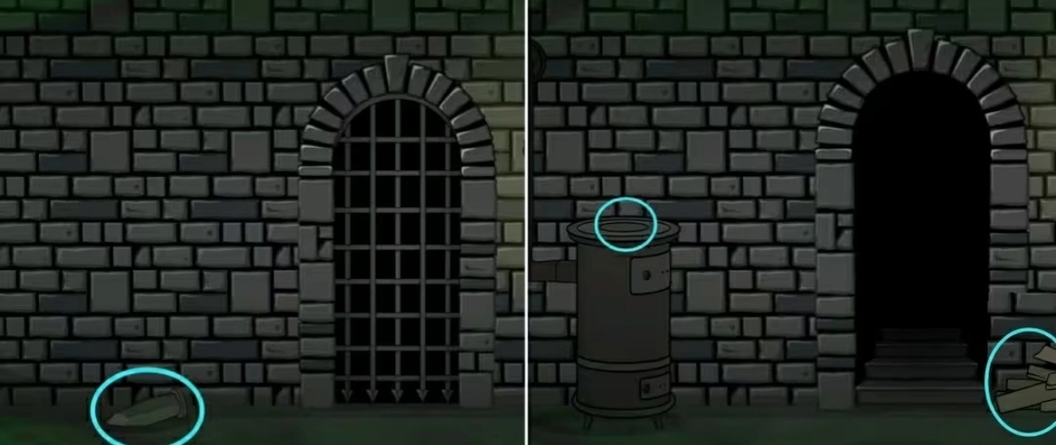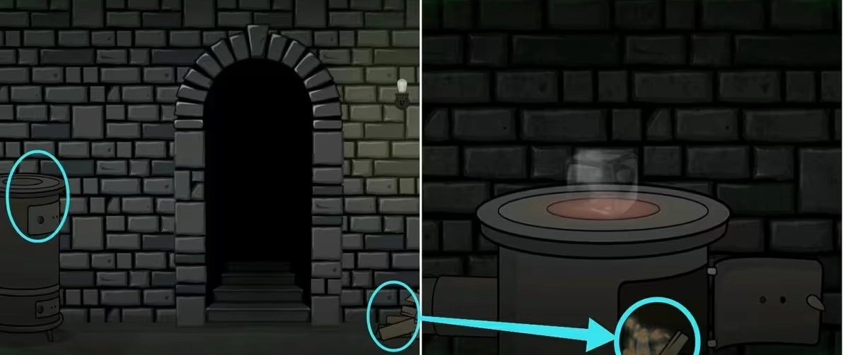 切换至“里”世界,拿走场景一的墙边的石柱和场景三中火炉上的火柴和右边的木柴。