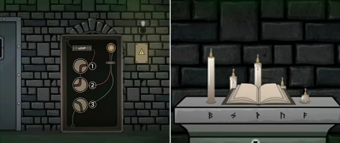 退出房间来到场景四(里)点击右边的电箱,先用螺丝刀卸下盖子,再换上保险丝并按③②①①的点击顺序完成上面的线路连接,之后进入房间用火柴点燃祭祀台上的蜡烛,注意观察蜡烛燃烧的位置高低和下面对应的符号。