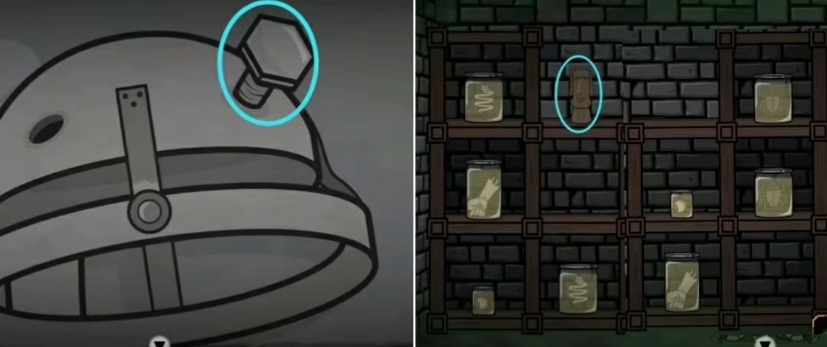 到场景四(表)右边的房间用扳手卸下医疗凳子顶部的螺母,再到场景二(里)左边的房间将标本罐放在架子上,然后根据前面获得的提示(如上图)将罐子摆放到正确的位置,完成后获得雕像。