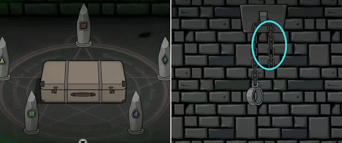 切换到“里”世界到场景四右边的房间,先将石柱放在左边地上的阵法中按海报上的提示摆放,然后将试管里的血滴在上面再放上牙齿完成仪式,接着打开出现的行李箱拿走里面的金十字和断线钳。