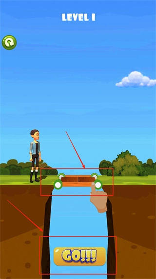 2、观察第1关的布局,点击黄色的“GO!!!”按钮启动游戏,借助绿色圆轮支撑的棕色木板搭建桥梁,红色箭头会提示操作位置。