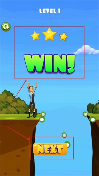 3、通关之后,查看第一关的胜利界面,要是有三颗金星就说明拿到满分了。你可以点击绿色的重玩按钮再体验一次,也能选择橙色的“NEXT”按钮进入下一关。此时穿蓝色衣服的角色会在悬崖边进行庆祝。